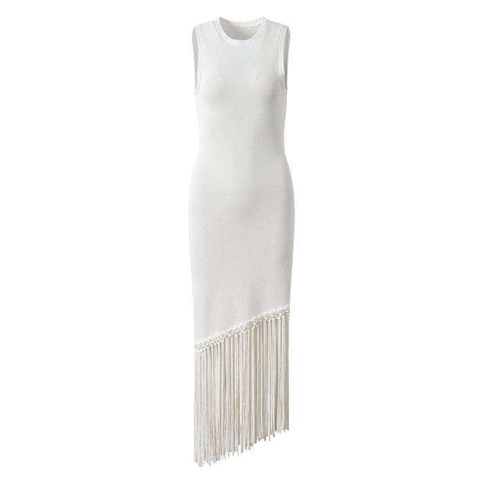 Celestia Sleeveless White Knit Midi Dress with Tassel Hem